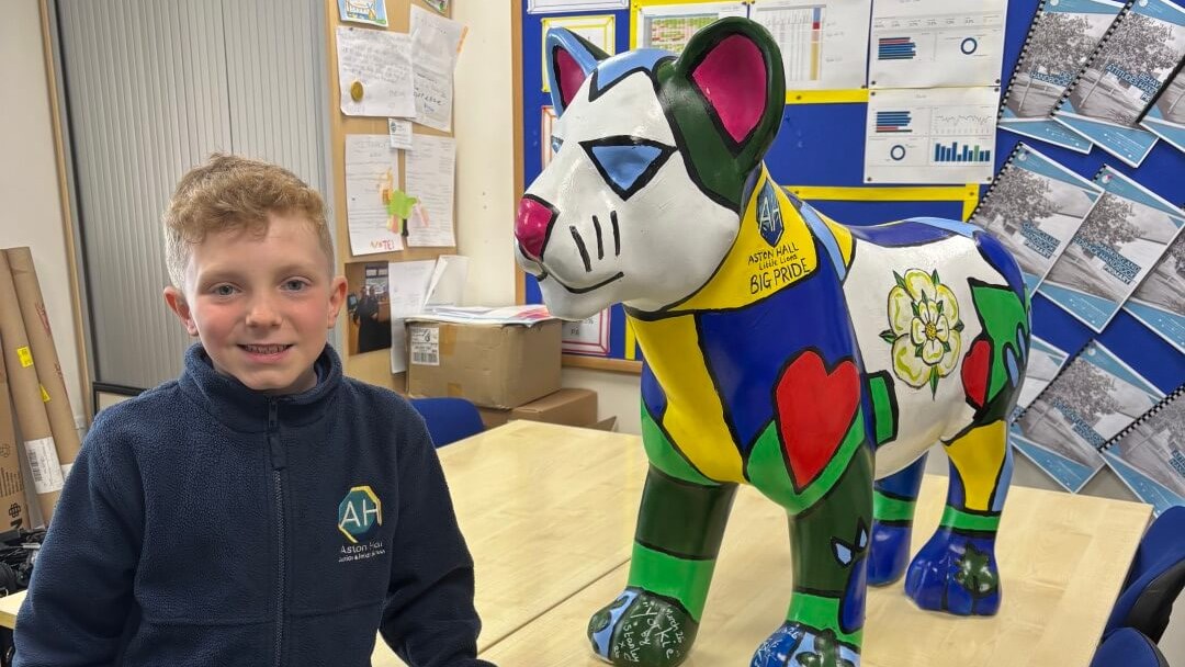 Here is our Pride of Yorkshire cub, designed and painted by Stan, alongside Mrs Woodcock. They have done an amazing job, and we are incredibly